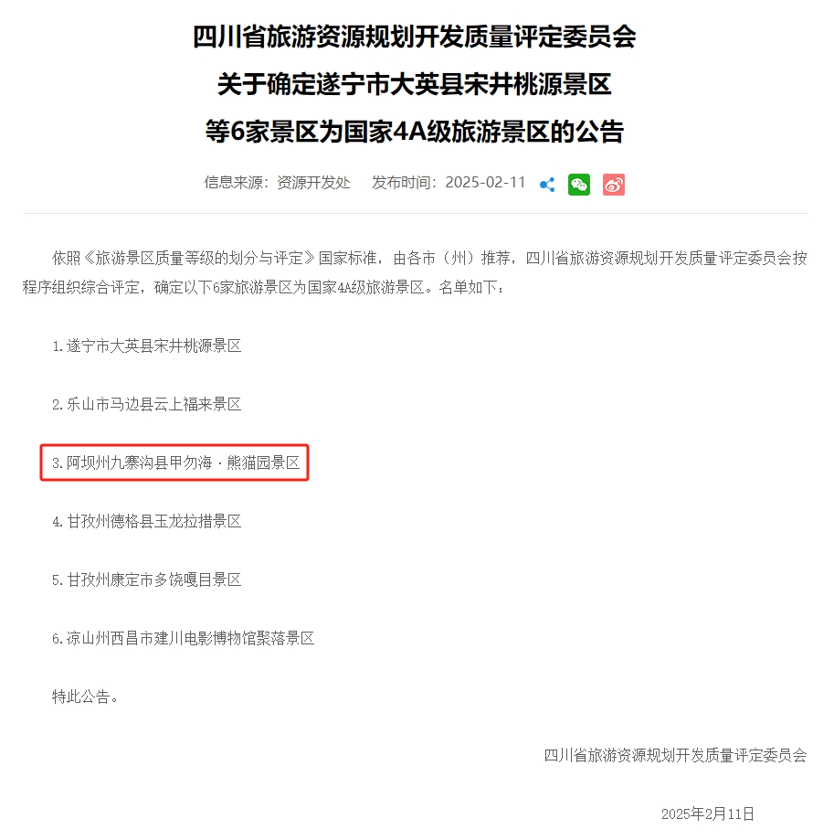 近日,四川省旅游資源規(guī)劃開(kāi)發(fā)質(zhì)量評(píng)定委員會(huì)發(fā)布公告,遂寧市宋井桃源景區(qū)、樂(lè)山市馬邊縣云上福來(lái)景區(qū)、阿壩州九寨溝縣甲勿?!ば茇垐@景區(qū)、甘孜州德格縣玉龍拉措景區(qū)、甘孜州康定市多饒嘎目景區(qū)以及涼山州西昌市建川電影博物館聚落景區(qū)已順利通過(guò)公示期,并正式確認(rèn)為國(guó)家4A級(jí)旅游景區(qū)。