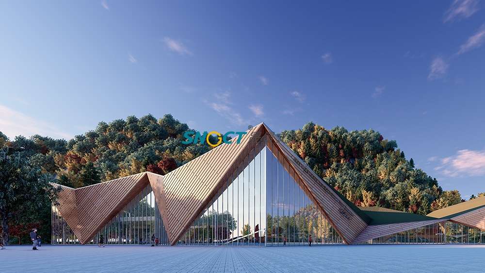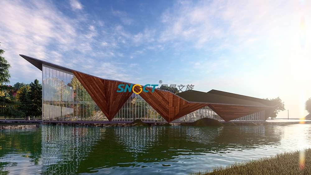 本項目建筑面積約2500平方米。方案設(shè)計上提取奶子溝“彩林、冰山、河川、生態(tài)”的印象標(biāo)簽,以“融合”為核心,將其貫穿起來,形成了“水為形,山為勢,山川一體”的設(shè)計概念,對標(biāo)國際冰川彩林旅游度假目的地的設(shè)計要求。