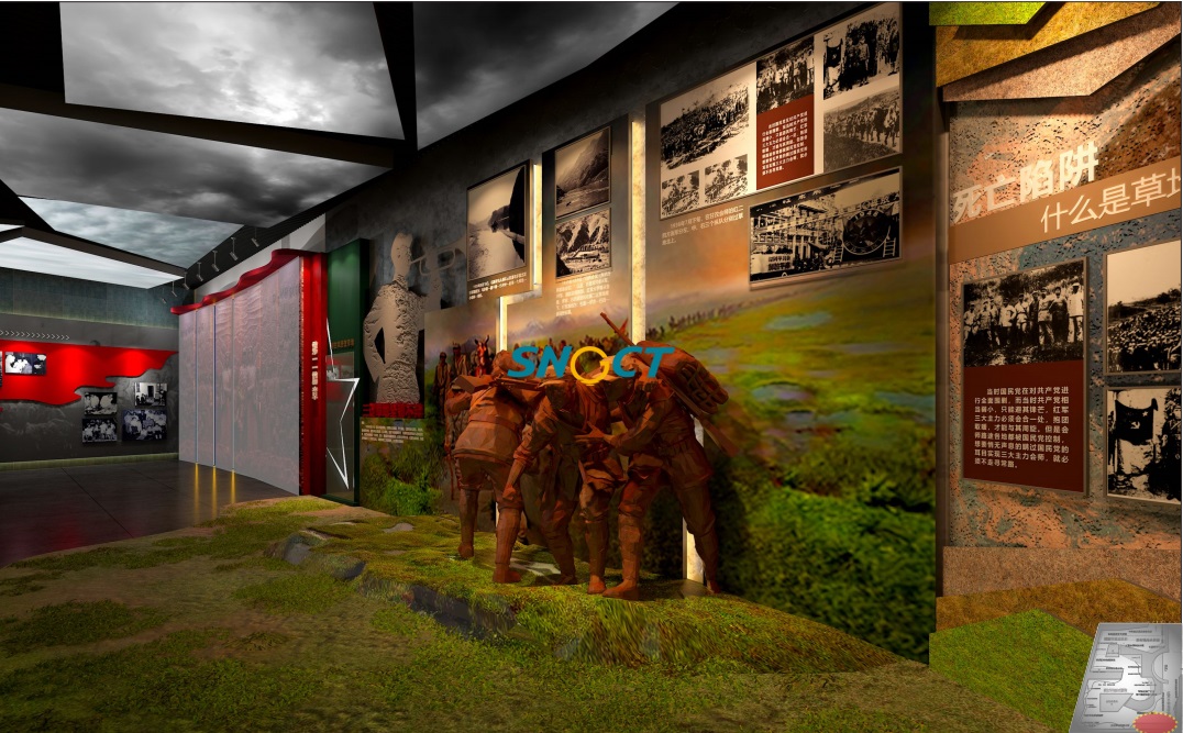 設(shè)計(jì)方案采用了多處場(chǎng)景體驗(yàn)和人物故事還原的展示手段,通過場(chǎng)景復(fù)原來展示若爾蓋段紅軍長(zhǎng)征的歷史,讓參觀者能沉浸式的體驗(yàn)到當(dāng)時(shí)環(huán)境惡劣和地方的艱苦;通過人物模型或者二維半的方式來展現(xiàn)若爾蓋段長(zhǎng)征途中的重要人物,以及紅軍們戰(zhàn)勝困難留下的事,深刻的刻畫出紅軍長(zhǎng)征的精神和斗志。